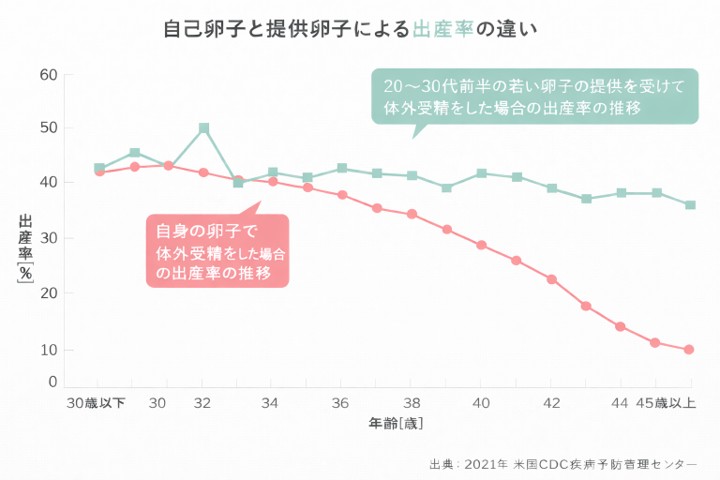 自身の卵子の妊娠率は年齢とともに低下しますが、提供卵子は年齢に関係なくほぼ一定(約40%前後)です。
