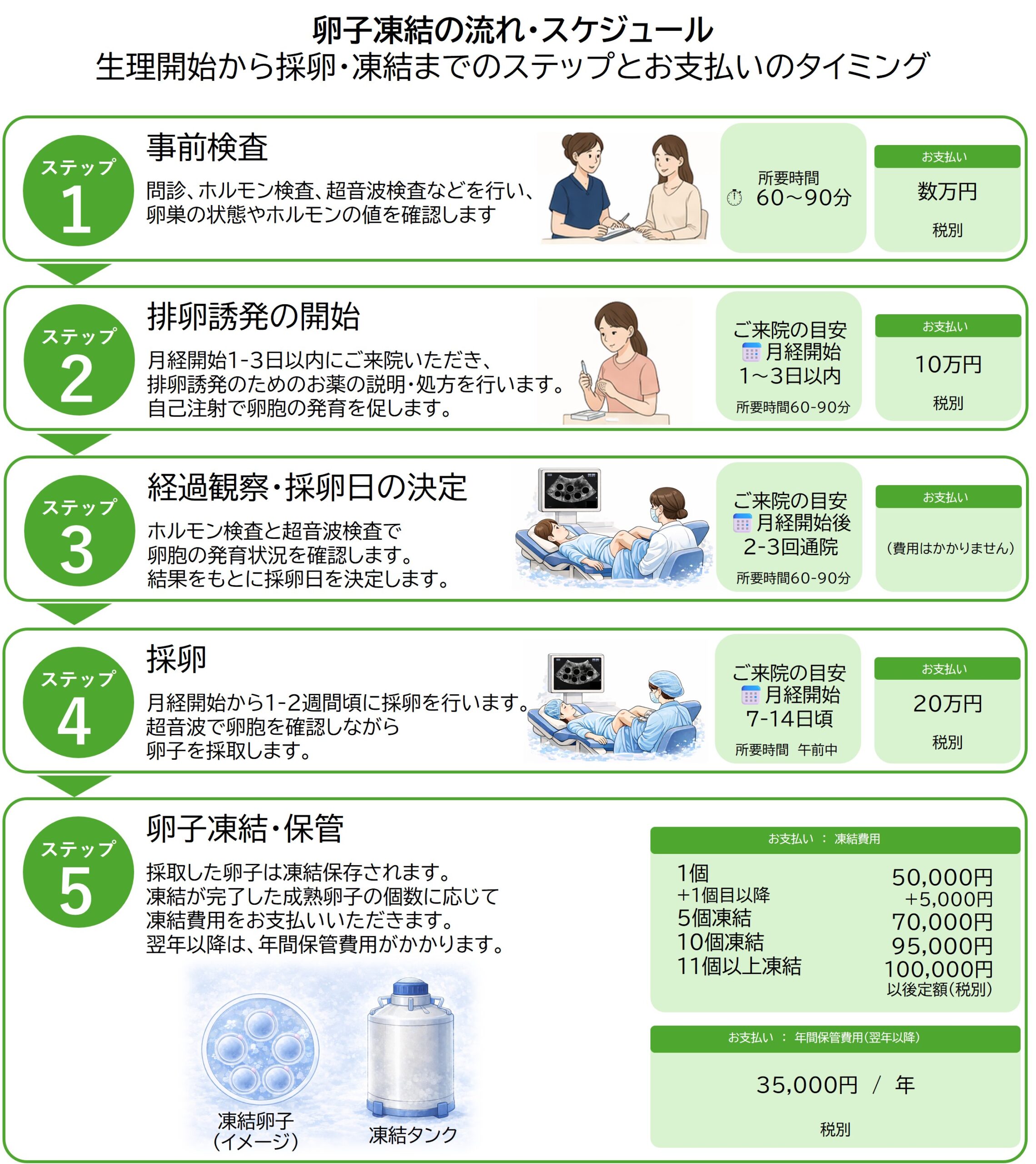 生理開始から採卵・凍結までのステップとお支払いのタイミングは以下のとおりです。